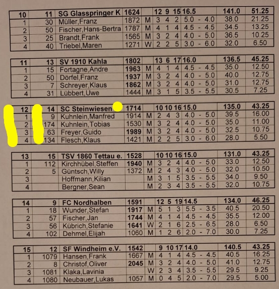 Hier was den SCS betrifft: Man erreichte Platz 12 von 15, und das vor der Bezirksligamannschsft des TSV Tettau, der ehemaligen Reginalliga- und jetzigen Bezirksoberligamannschaft des FC Nordhalben, und den Gastgebern der Schachfreunde Windheim.