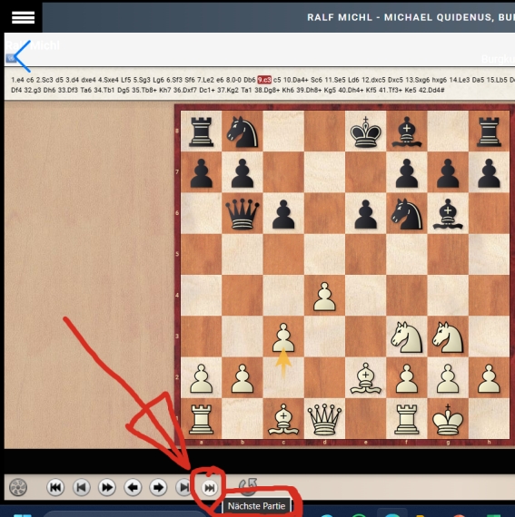 Was viele oft nicht finden, ist, wie man zur nächsten Partie weiter schaltet. Hier ein Screen Shot mit einem roten Pfeil. Da drauf klicken! :-)